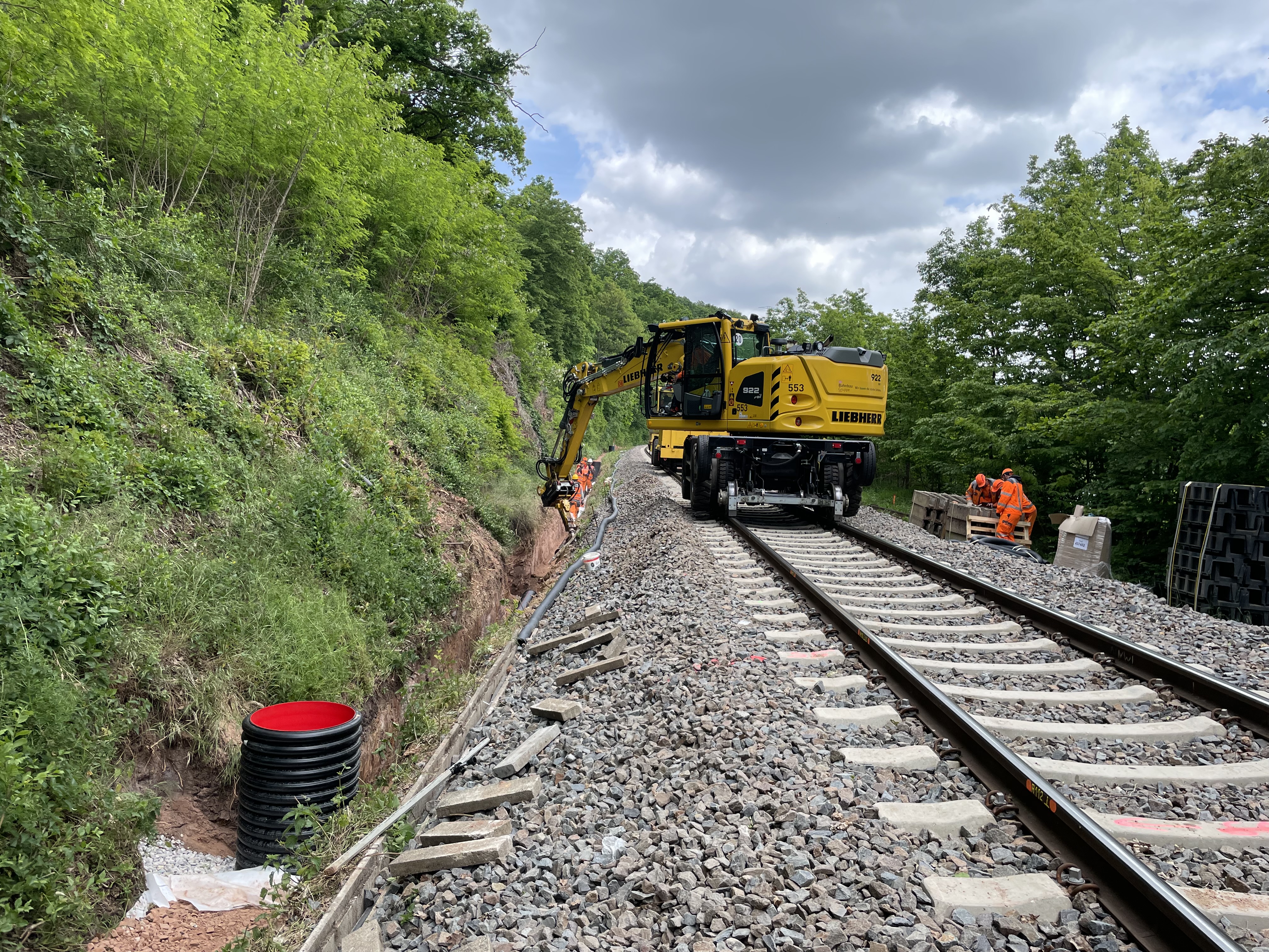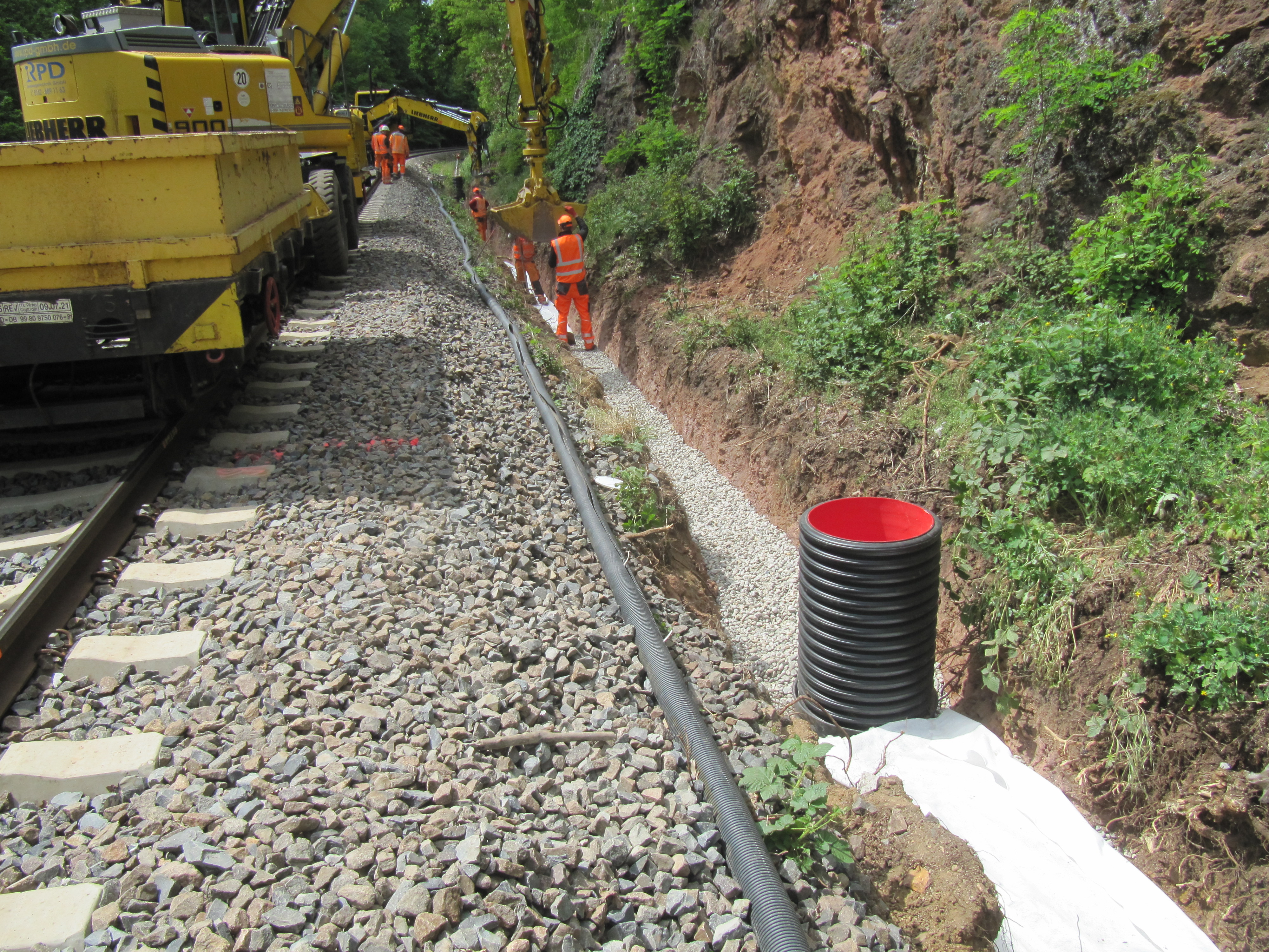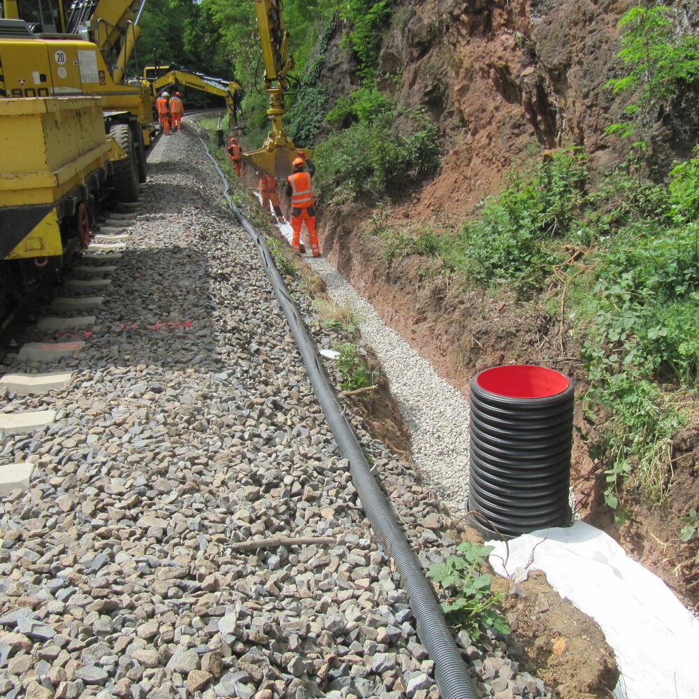 Auf Basis der vorhandenen Baugrunddaten, aktueller Gleislagemessungen und eigener Ortstermine analysierte GEPRO die Schadensursache und entwickelte eine passende technische Lösung. Maßgebende Ursache der Probleme war eine unzureichende Entwässerung des Streckenabschnittes. Die von uns geplante Ertüchtigungslösung umfasste daher: